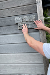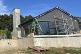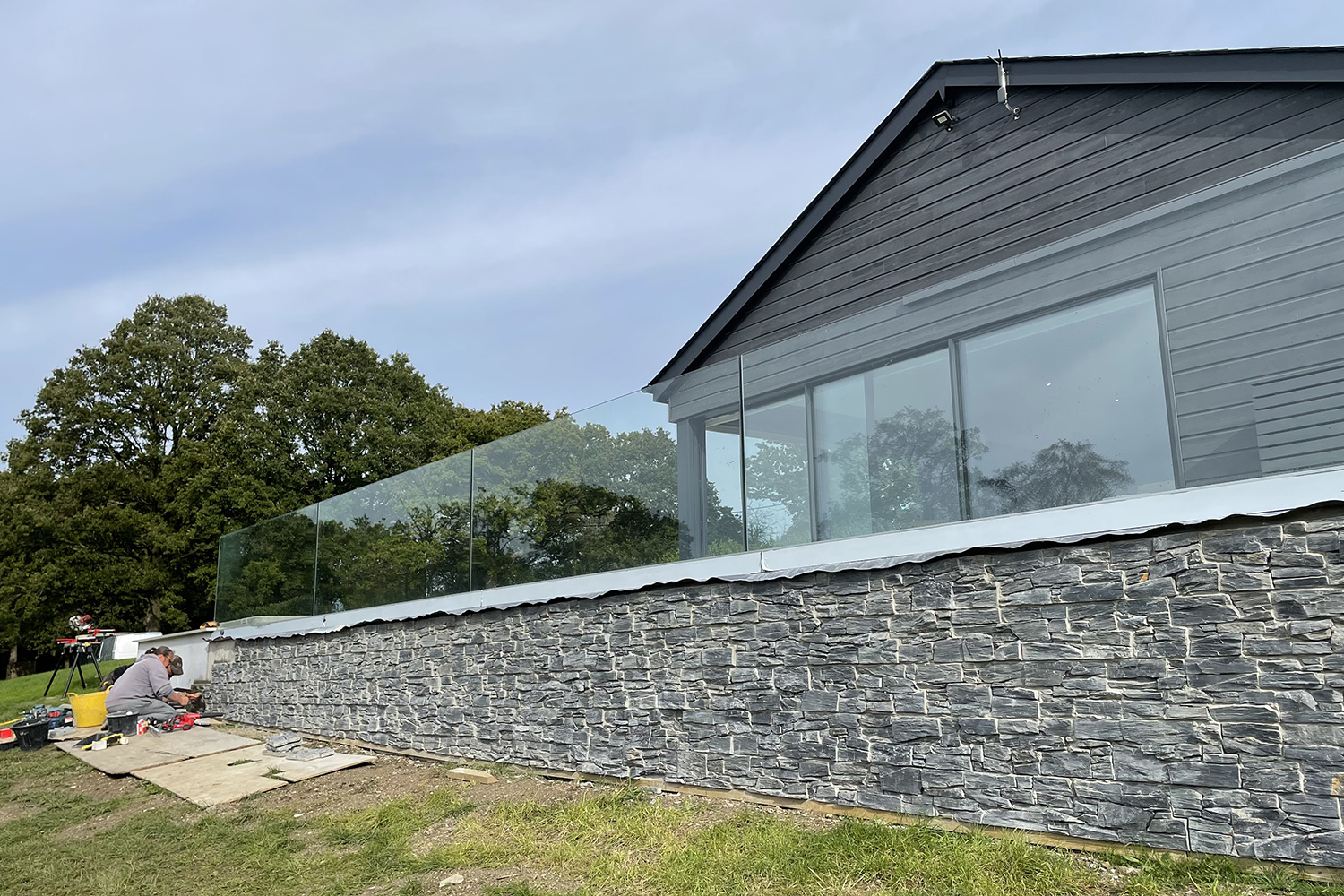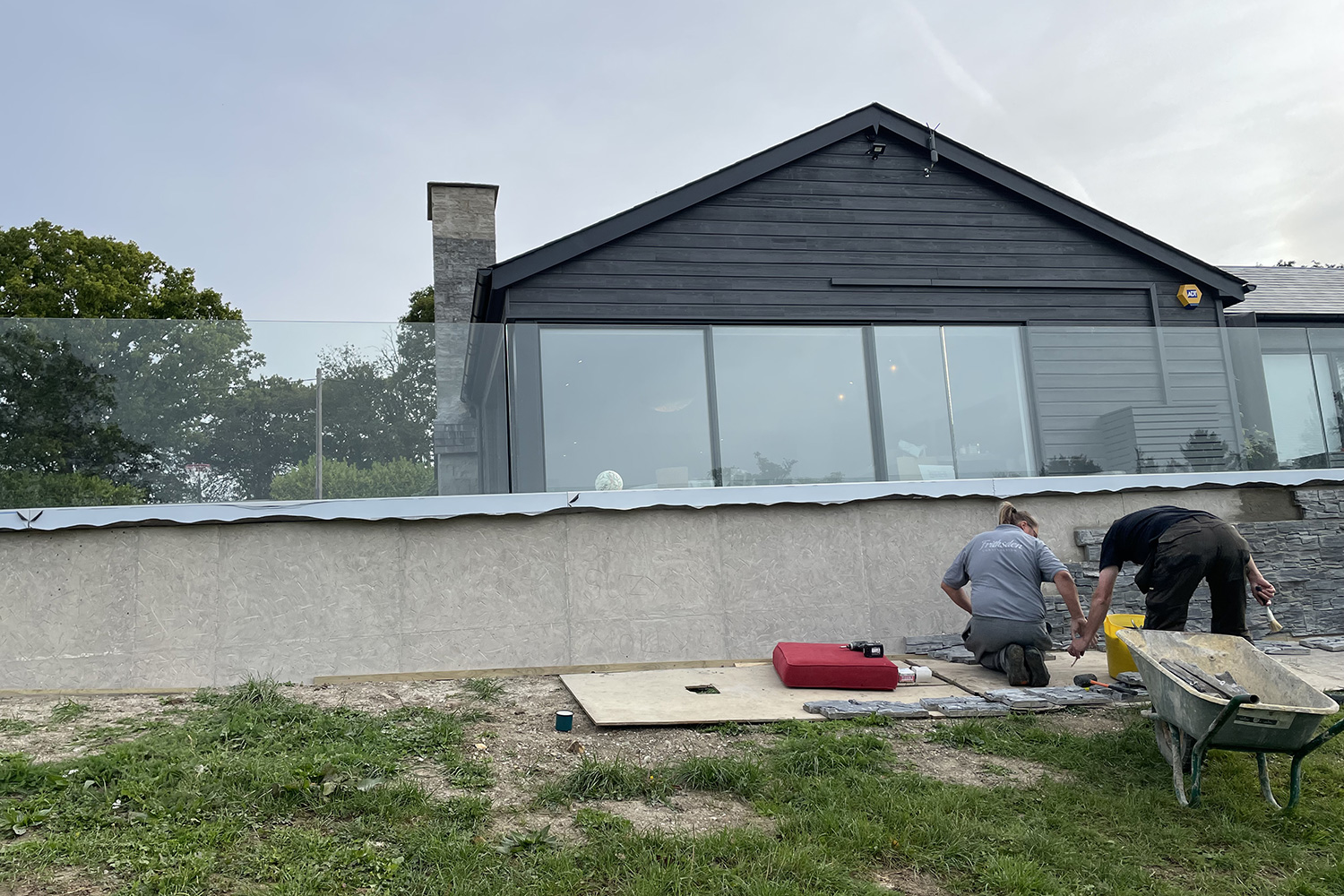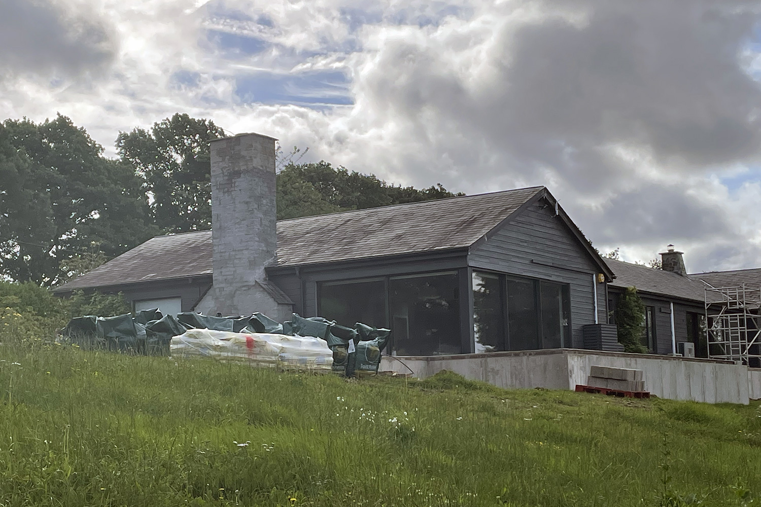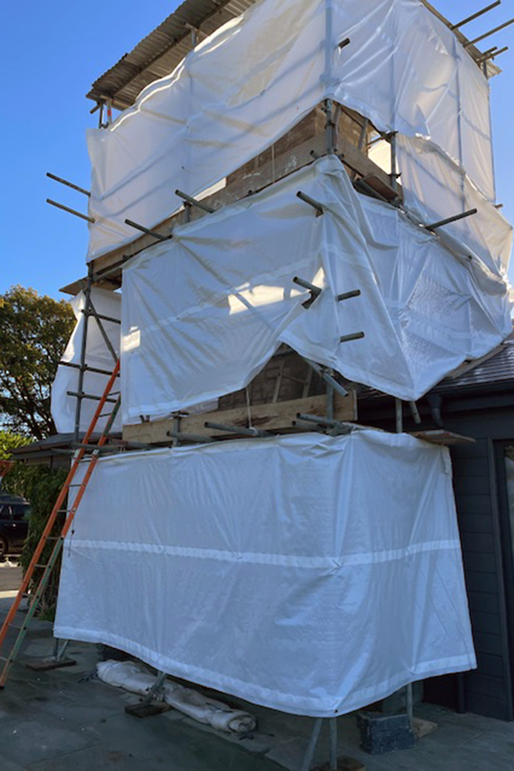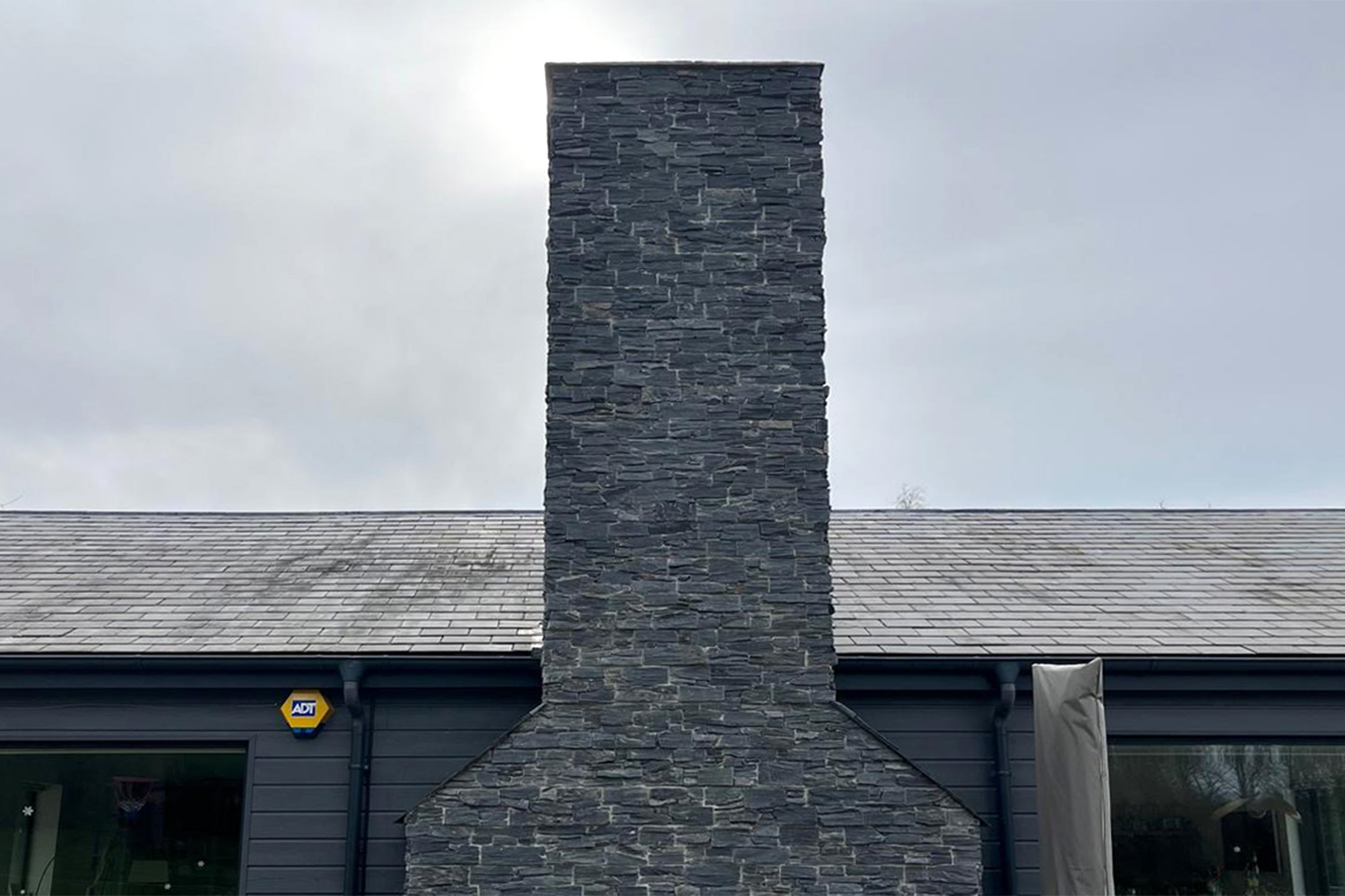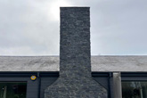 A key element of the works was working with external slate textured tiles, with an interlocking fitting system. An area that was new to our team, and some companies were daunted by the extensive meterage given how time consuming it was to fit such tiles. So after discussing the best options with the clients, the FC team decided they were up for a challenge, and after attending the suppliers training sessions, several weeks later they had achieved an excellent job, with real attention to detail for a quality finish to the wrap around retaining wall, and large feature chimney. With additional scaffolding and ‘tin-hat’ protection whilst we also dealt with the failing chimney.