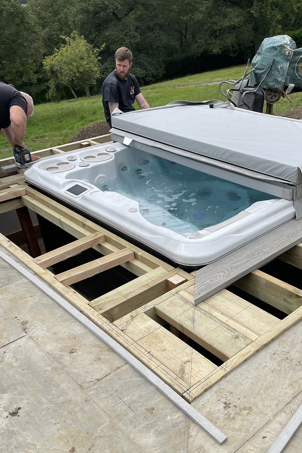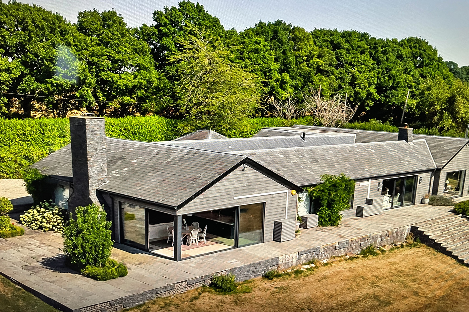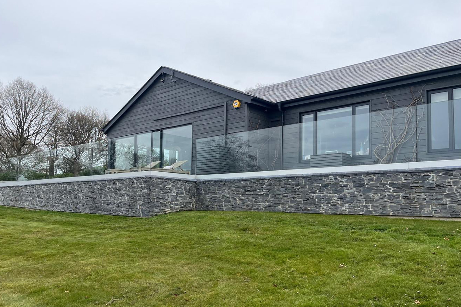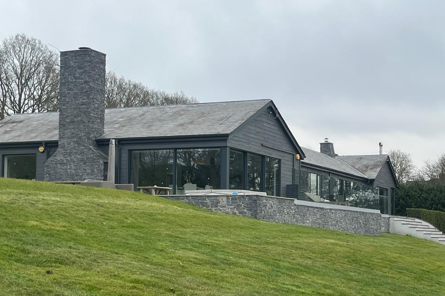 The main scope of works was incredibly varied, involving replacing the flat roof area, internal refurbishment & complete redecoration throughout, full audio-visual requirements throughout for stereo sound and TV/WIFI, including an advanced security and dual gate entry system. Various plumbing & electrical works, and bespoke cabinetry works. Externally all the timber cladding was repaired and renovated, the wrap around patio area extended, incorporating large concrete supporting walls, and bespoke glass balustrading. Not forgetting the bespoke recessed hot tub area, so the family can enjoy a dip whilst enjoying the far-reaching views!