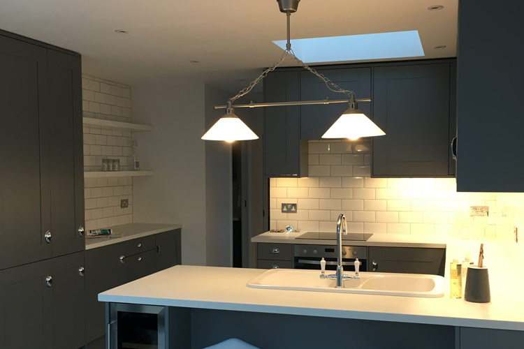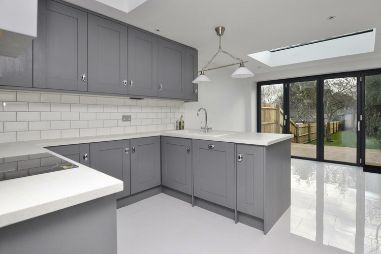 But once all the gutting had taken place and we were literally left with the bare lath and plaster side walls and no roof, we were able to carefully rebuild and bring the house back to modern times – re-plumbing and re-wiring throughout and adding traditional Victorian period fittings, along with on-trend grey shaker kitchen with white brick tiles and worktops, bi-fold doors and a feature rooflight to the dining area.